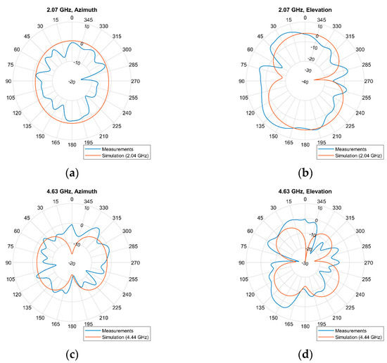 Next, the radiation patterns for these three modes at 2.07, 4.63, and 6.22 GHz, on both the azimuth and the elevation planes, are illustrated in Figure 11. Like before, the azimuth angle will be referred to as φ, while the elevation angle is defined as θ. Furthermore, the simulation results at 2.04, 4.44, and 6.42 GHz are also included in the figure.