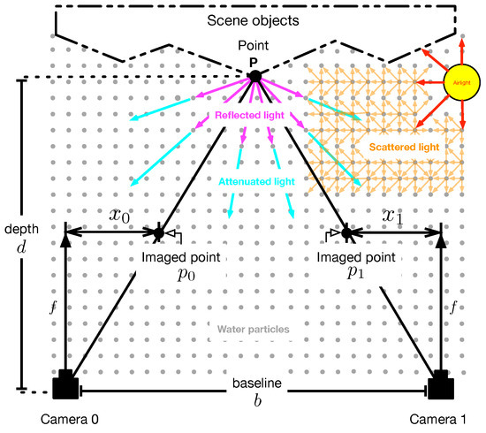 Let be a point of a scene under the influence of a scattering medium that is imaged by a binocular camera array, as depicted in Figure 1. Let and be the pixel point of in the image plane of the left and right camera, respectively, given as [32]