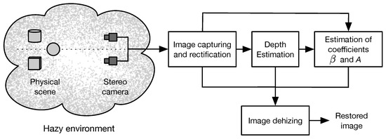 A suggested procedure for the restoration of images captured in a scattering medium is depicted in Figure 2. Initially, a pair of images of the scene is captured with a binocular camera array. Next, the captured images are rectified to meet the horizontal epipolar geometry [32]. The resultant rectified images are preprocessed to improve their visibility by applying a locally-adaptive contrast enhancement method [33]. Afterwards, the improved images are processed by stereo-matching to obtain estimates of the depth functions of the scene by triangulation using the computed disparity map [28]. Next, the hazy images , estimated depth , and disparity map are used to estimate the atmospheric parameters and A in a proposed algorithm based on the Monte Carlo method [34]. Finally, haze-free images of the scene are obtained using the restoration model given in Equation (2). In the next subsection, we explain in detail the proposed method for accurate estimation of the required components for the restoration model given in Equation (2).