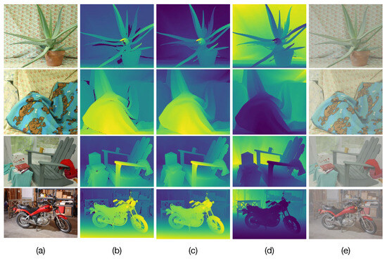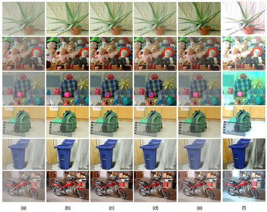The main challenge in the construction of synthetic images degraded by optical scattering lies in applying proper refinement techniques to remove these unknown values. This is because the unknown disparity values can lead to undesirable artifacts in the resulting synthetic images degraded by optical scattering and introduce errors in the estimation of atmospheric parameters as well as image restoration. To remove these unknown values, the ground-truth disparities are preprocessed with the hole-filling method presented in [28], obtaining refined disparities as shown in Figure 3c, where the unknown disparities are removed. Next, the undegraded binocular images of the dataset and their corresponding refined disparities are utilized to compute the scene depth by solving Equation (11) as detailed in Section 3.1, by considering the camera parameters specified by the Middlebury dataset. The computed depths for the images shown in Figure 3a are depicted in Figure 3d. Finally, test images degraded by optical scattering for prespecified values of the atmospheric parameters A and are constructed using Equation (1) from the undegraded images and computed depth. Figure 3e presents examples of the constructed test images degraded by optical scattering from the undegraded images shown in Figure 3a.