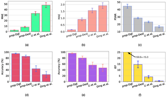 Results with confidence of atmospheric parameter estimation and image restoration using the proposed method with ground-truth disparities (prop-Dgt), the proposed method with estimated disparities (prop-Dest), the method by Li et al. [23], and the method by Ding et al. [25]. (a) MAE in estimation of A. (b) MAE in estimation of . (c) PSNR of image restoration. (d) in estimation of A. (e) in estimation of . (f) of image restoration.