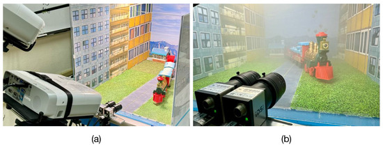 First, undegraded images of the scene are captured using a binocular camera array when the chamber is free of scattering particles. The binocular camera array comprises two UI-3880CP-C-HQ R2, Imaging Development Systems, Obersulm, Germany, digital cameras with pixels and 8 mm focal length imaging lens mounted on a horizontal fixture with a mm baseline. The ground-truth depth of the scene is computed using three-dimensional spatial point computation by fringe projection profilometry [36]. The implemented fringe projection system consists of a binocular camera array and a pair of PowerLite W30, Epson, Suwa, Nagano, Japan, LCD projectors with a resolution of pixels, as depicted in Figure 6a. The intrinsic and extrinsic parameters of the cameras and projectors of the fringe projection system are determined using the calibration method proposed in Ref. [43]. The resultant estimated parameters are summarized in Table 2. Next, the captured images of the scene, denoted as and , are rectified through the projective transformation method [32]. The rectified, undegraded image and ground-truth depth of the scene computed through fringe projection are presented in Figure 7a,b, respectively.