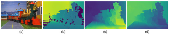 We construct a test set of binocular images degraded by optical scattering using images of the well-known Middlebury stereo dataset [39,40,41]. This dataset contains several rectified stereo images and provides the corresponding ground-truth disparities. Figure 3a,b show examples of the dataset images and ground-truth disparities. Note that the disparity maps shown in Figure 3b contain dark color regions representing unknown disparities values.