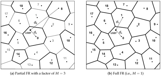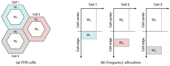 To achieve large system throughput, base stations are densely deployed in recent cellular networks. When users within a cell have resources orthogonal to each other, the primary source of interference is inter-cell interference. Inter-cell interference coordination [1,2] is a method used to improve system performance in such cellular systems, and a fractional frequency reuse (FFR) strategy is suggested as a simple inter-cell interference coordination scheme for orthogonal frequency-division multiplexing access (OFDMA)-based cellular networks [3]. We let M denote the frequency reuse (FR) factor. In the FFR system, the frequency bandwidth is split into two orthogonal bands so that users located close to the center of a cell utilize the band with , which is referred to as full FR, and those near the edge of a cell use the band with , which yields partial FR. As a result, a FFR cell is split into full FR and partial FR regions. An example of the FFR systems is shown in Figure 1. Full FR coverage, also called the distance threshold, serves to differentiate between full FR and partial FR regions within a cell. Full FR coverage has a significant effect on FFR networks performance [3,4,5,6,7,8,9,10,11,12,13,14,15].