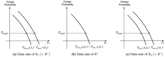 Based on (9), for the data rates of , the outage probabilities of full FR and partial FR are qualitatively depicted in Figure 3. In contrast to [22] (Figure 1), no error floors are shown for the outage probability curves since SINR, given by (5), approaches infinity as approaches infinity. Thus, a given target outage probability, denoted by , is achieved for any data rate, provided is sufficiently large. Figure 3 shows that the preference between full and partial FRs depends on the data rate. For a low data rate , partial FR is preferable to full FR. For a high data rate , however, full FR is preferable to partial FR. For a data rate of , full and partial FRs are equally preferable. Furthermore, as shown in Figure 3, as the data rate increases, the preference shifts only from partial FR to full FR. Conversely, when the data rate decreases, the preference transitions only from full FR to partial FR.