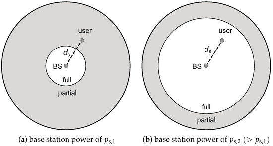 Figure 4 depicts the change of the optimal full FR coverage in a single cell as the base station power in that cell is scaled. In Figure 4a, the base station power is , and the user, which is at a distance from base station, is assumed to be in the partial FR region. As base station power increases to , SINR, given by (5), also increases. As a result, a higher data rate can be employed, while a given target outage probability remains satisfied. As shown in Figure 3, the change in preference can only occur from partial FR to full FR as the data rate increases. As the point of this change, the user’s location, which is at a distance of from the base station, shifts from the partial FR to the full FR region. As a result, as illustrated in Figure 4b, the optimal full FR coverage extends.