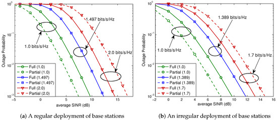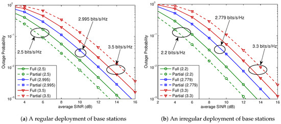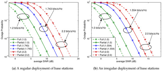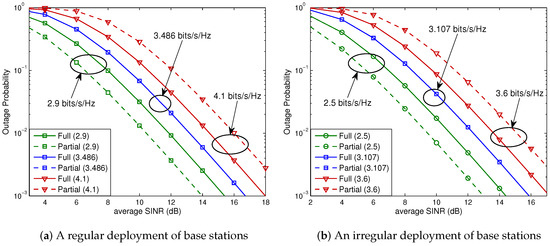 In this case, from (27), we obtain (bits/s/Hz) (i.e., (Mbits/s)). As shown in Figure 6a, if the spectral efficiency is lower than , partial FR is preferable for all SNRs (i.e., for all base station powers), while full FR is preferable if the spectral efficiency is higher than . On the other hand, for the spectral efficiency equal to , the full and partial FR schemes perform exactly the same. Note that these observations were predicted by the analysis given by (9) of Theorem 1. We next consider a hexagonal cellular network with an irregular layout of base stations shown in Figure 5b. The associated outage probabilities for 1.0, 1.389, and 1.7 (bits/s/Hz) are shown in Figure 6b. For this case, (27) yields (bits/s/Hz). It is seen that the analytical results given by (9) of Theorem 1 also hold for a hexagonal system with an irregular base station layout.