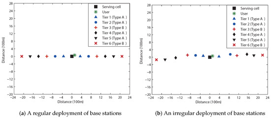 In this evaluation, as an example, system parameters are set to (m), , (MHz), (dBm/Hz), (watt), , and , where (GHz) is the carrier frequency. We first consider the hexagonal cellular network that comprises 37 base stations (i.e., ), which are deployed either in a regular or in an irregular fashion. The base station layouts used for this evaluation are shown in Figure 5, where the partial FR factor is and we can divide 36 neighboring cells into three tiers according to their distances from the serving cell. Cells that only interfere with the user located in the full FR region of the serving cell are referred to as Type A. Type B cells are those that interfere with users in both the full FR and partial FR regions. The numerical results for the regular base station layout are depicted in Figure 6a; for the spectral efficiencies of 1.0, 1.497, and 2.0 (bits/s/Hz) (or, equivalently, for the data rates of 10.0, 14.97, and 20.0 (Mbits/s)), the outage probabilities for a MIMO system of OSTBC, given by (26), are evaluated. Substituting (i.e., partial FR factor of 3) into (10), we obtain