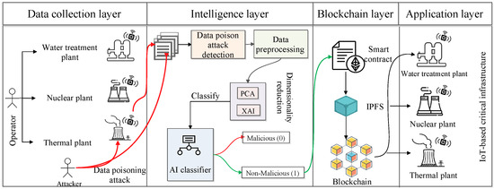 The layer comprises various critical infrastructures such as water treatment, nuclear power, and thermal plants that use the classified data for further analysis and research. For example, the operators or employees who work in the water treatment plant infrastructure aim to increase the quality of human life by providing pure water. Therefore, they improve the water quality based on the data received from the blockchain. From the blockchain network, they receive non-malicious data that directly affects human life. Nuclear power plants and thermal plants work in a similar manner. Therefore, the proposed architecture is useful in this type of IoT-based critical infrastructure environment.
