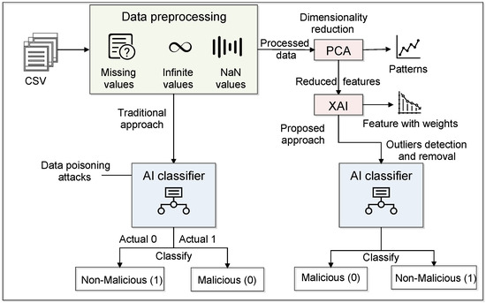 Figure 2 shows the workings of the traditional and proposed approaches. Initially, we fed the data into AI classifiers without applying any feature selection or dimensionality. The proposed architecture follows the steps of pre-processing, feature selection, and classification that give better performance to deal with the data poisoning attack in the IoT-based critical infrastructure. The first feature selection approach is PCA, where we have reduced the number of features by applying five steps [35]. The first step is standardization, where we have to standardize the range of the continuous initial variables so that each one of them contributes equally to the analysis. This method is also known as normalization, where we transform the data to comparable scales that can prevent biased results. The next step is covariance matrix computation, where we identify the correlation between input data. Furthermore, it calculates the eigenvectors and eigenvalues from the covariance matrix. After that, sort the eigenvalues in decreasing order. Here, sorting is performed in such a way that there is no loss of information about which eigenvalue corresponds to which eigenvector. The last step of PCA is to form a new feature set in terms of the matrix. In this matrix, we kept column entries as eigenvectors, and every row of the eigenvector matrix corresponds to one eigenvector value. In the end, we transpose the selected eigenvector as column entries, which is called a feature matrix. These techniques use the PCA class from the decomposition module of the Sklearn library in the Google Colab notebook.