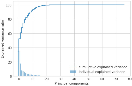 - PCA: It is an AI approach that transforms the columns of a dataset into a new set of features known as principal components. It effectively compressed the data into fewer feature columns that enable dimensionality reduction. Figure 3 shows the PCA-based feature selection approach. Initially, the dataset contains 83 features used for the IoT-based critical application. However, these large numbers of features make it time-consuming to train our AI model. Therefore, using the PCA approach, we have significantly reduced the number of features from 83 to 35. From the graph, we observed the importance of feature selection to reduce the number of dimensions and improve the performance of the IoT-based critical application.