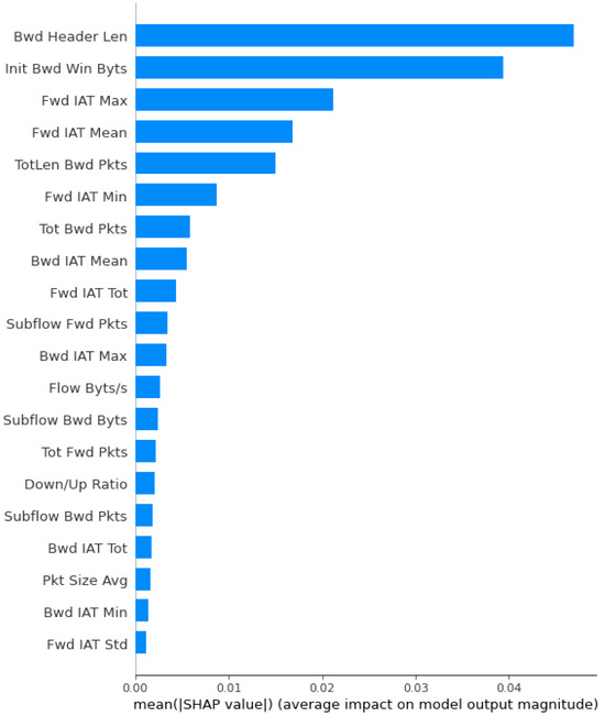 Figure 3. Feature selection using PCA (35 out of 83 features are selected). - XAI: Furthermore, we applied XAI to select more specific features based on the feature score. Initially, we identified 35 features out of 83 using the PCA approach. However, we found the requirement to reduce the feature count further to achieve notable results for AI classifiers in terms of accuracy, precision, and F1 score. Figure 4 depicts the feature selection process of the XAI-based approach. From the results, we observed that there are 20 features, such as Bwd header len, Init Bwd win Byts, Fwd IAT Max, Fwd IAT Mean, etc., that are important and have a higher weight than other features. Therefore, we have passed the selected features to the different AI classifiers.