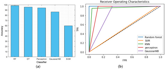 This section illustrates the performance of the proposed AI classifier that classifies whether the data is malicious (class 0) or non-malicious (class 1) for the IoT-based critical infrastructure. Figure 5a depicts the comparison of the classification accuracy of the different AI classifiers, such as RF, DT, perceptron, GaussianNB, and SVM. From the graph, we found that, due to the large dataset, SVM is computationally expensive. Moreover, SVM requires more training time, and target classes are overlapped when the dataset has noise. As a result, it becomes slow and ineffective for real-time data classification in IoT-based critical infrastructure. Furthermore, GaussianNB is a probabilistic classifier that applies Bayes’ theorem with strong independence assumptions. This assumption of all features being independent of each other is not the case in the dataset. Therefore, the GaussianNB classifier does not perform well for the given classification problem. In contrast, the selected features are on various scales; RF still performs well and offers higher accuracy than the other classifiers. It provides the probability of belonging to a class of malicious or non-malicious data with 98.46% accuracy. Table 3 displays other parameters, such as precision, recall, and F1 score, to showcase the remarkable performance of the RF classifier.