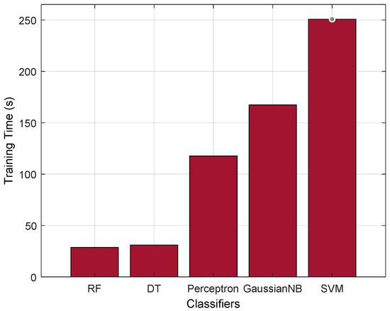 Furthermore, to justify the performance of the RF classifier, we evaluate it with the training time parameter. From Figure 6, we can observe that the RF has a better training time, i.e., 28.641 (s), compared with the existing AI classifiers. RF is essentially a collection of multiple DTs, each constructed on a different subset of the training data and with a subset of the available features. The ensemble approach of RF offers advantages such as parallelism and reduction in overfitting, because of which it significantly reduces the AI training time.
