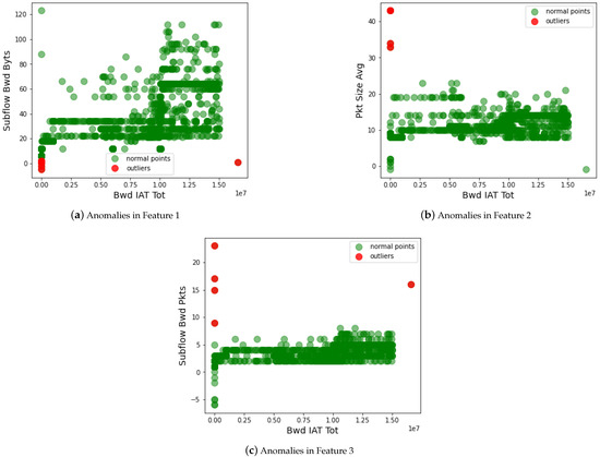 In addition to statistical analysis, we also measured the security of the AI classifier by removing the anomalous data on the dataset. Formally, this is done before the classification to strengthen the performance of AI classifiers. We analyze the feature space of the dataset using different techniques, such as outlier detection, normalization, distribution of data, and many more. This approach helps to tackle the data poisoning attack on the IoT-based critical infrastructure. Figure 7 shows the performance of the data poisoning attack detection approach. In the dataset, the attacker manipulates the essential reading of IoT data, which deteriorates the regular operation of critical infrastructure. For instance, a criminal (being an attacker) modifies the criminal data (e.g., arrest to not arrest) from the servers of the police department. Such anomalous data needs to be identified and removed from the feature space of the dataset. Therefore, we identify the outlier in the dataset, which helps to improve the security against the data poisoning attack on the dataset. From the graph, we observed that the green dots show actual data of the critical infrastructure, and the red dots are the outliers in the dataset. The outlier manipulates the results of the actual information of the dataset. Due to this, the AI classifier misleads and performs the wrong classification. Such outliers are removed from the dataset, and only the correct data is forwarded to the AI classifiers for data training.