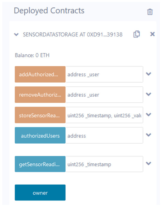 This section analyzes the performance of the blockchain network in terms of scalability. The designed smart contract is integrated with the IPFS (on-site storage) via an open-source platform-Filebase. It offers a Filebase bucket where a content identifier (CID) is generated for each file. The CID is further integrated with the Remix development environment. Furthermore, the smart contract is compiled using a solidity compiler and deployed on a Sepolia test network. Figure 8 shows the deployed smart contract comprised of authorization entities and storing the sensitive data of critical infrastructure on the Sepolia test network.