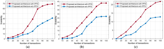 Scalability comparison with IPFS and without IPFS. (a) CPU at 5% utilization. (b) CPU at 50% utilization. (c) CPU at 80% utilization.