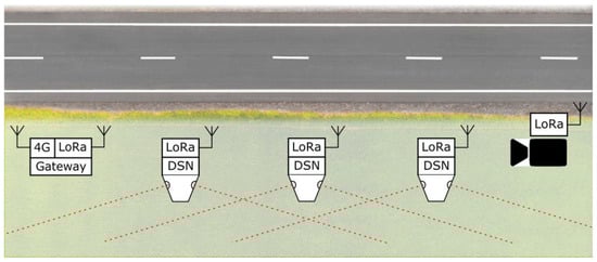 The proposed detection-signaling nodes (DSNs) are installed on the roadside-marker posts (Figure 1). Roadside-marker posts, according to the standard, must be installed every 50 m on trunk and country roads. In the cases of straight sections of the roads, the distance between the marker posts can be increased to 100 m due to economical and technical reasons [40]. Roadside-marker posts are anchored to the roadside at least 0.5 m depth.
