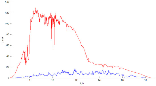 The experimental assessment of the expected average solar panel current was performed under various lighting conditions in March–April 2021. The current generated by polycrystalline solar panels with an area of 66 cm2 (batteries of a similar size are expected to be used in DSN prototypes) was recorded when the voltage generated by it was higher than 3 V. The long-term data-acquisition results are shown in Figure 6.