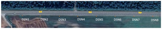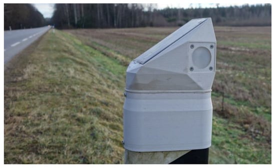 For experimental research, the first batch of DSNs (eight units) was produced with slightly different angles of placement of the sensors in relation to the road (inclination of the side sensors from the road −5 and −15 degrees) and also with a rain cover installed over one of the side sensors. Sensors were installed on the Kaunas–Šakiai (41 km) road section (Figure 9) for one month.