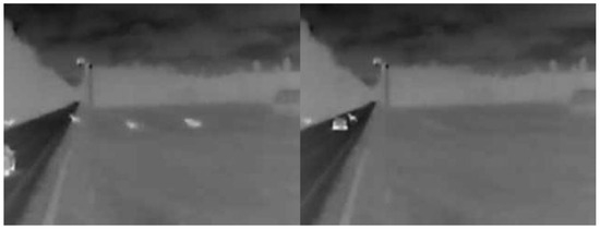 After extending the research in March and April 2022, as expected, a significant increase in animal activity was observed in the monitored section (especially in April). On 6 April at 5:00 a.m. 54 min, a series of thermal imaging images of a timed emergency were captured (Figure 14), where a group of several deer ran across the road from the right side, and the last animal was nearly hit by a passing car.