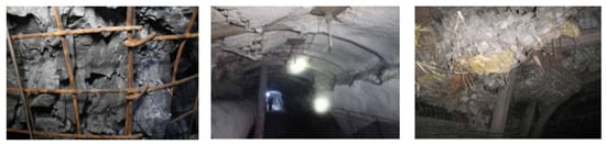 The coal industry accounts for 59% of the primary energy in China. As the “Belt and Road” is developing rapidly worldwide, coal consumption will continue to grow in the future. However, with the increasing depletion of shallow coal resources, deep roadway excavation has become the main direction in the development of coal mining []. In the deep strata, after the roadway is excavated, affected by the overlying loads, the integrity of the surrounding rock is destroyed, and the self-supporting capacity is lost. Due to geological characteristics such as high stress and extremely broken rock, the surrounding rock of the mining roadway exhibits low strength at the engineering scale (Figure 1). Disasters including squeezing, bulging, and swelling in deep roadways are widely observed, which seriously affect personnel safety and economic benefits in deep roadway construction, restrict the rapid tunneling of roadways, and threaten the safe production of coal mines [,,].