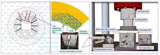 Relevant studies have tested the bearing characteristics of anchoring–grouting reinforcement under different rock particle sizes, lithologies, and other factors [,]. Still, no preload was considered. The preload is an essential embodiment of the active support, which can increase the overall support strength of the roadway. Therefore, it is of great significance to analyze the mechanical characteristics of the anchoring–grouting system with preload applied in order to further reveal the mechanism of the anchoring–grouting system in weak and broken surrounding rock.