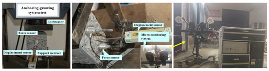 The test process was as follows: Firstly, we placed the anchoring–grouting system into the electronic precision material machine, adjusted the direction so that the center of the anchoring–grouting system was in a straight line with the pressure head of the testing machine, and then rotated the nut to apply preload force to the anchoring–grouting system. We set the loading rate to 0.01 mm/min, started the testing machine and data collection system, and then started the anchoring–grouting system bearing test.