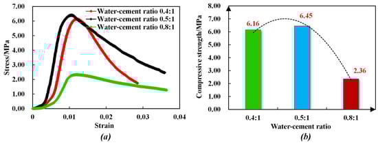 Stress–strain curve of anchoring–grouting system with different water–cement ratios. (a) Stress–strain curve. (b) Compressive strength histogram.