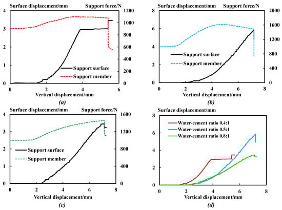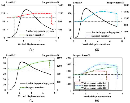 Relationship between the monitored loads/force and the vertical displacement of the anchoring–grouting system and the support members. (a) Water–cement ratio: 0.4. (b) Water–cement ratio: 0.5. (c) Water–cement ratio: 0.8. (d) Stress comparison curve of supporting members.