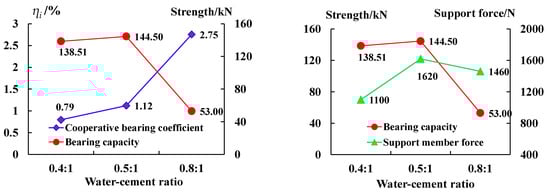 (4) With the increase in the water–cement ratio, the stress of supporting members increases first and then decreases. The peak stress of the supporting members of specimens with water–cement ratios of 0.4, 0.5, and 0.8 is 1100 N, 1620 N, and 1460 N, respectively, and the stress increase rates of the supporting members are 22%, 62%, and 46%, respectively.