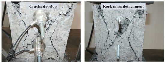 (3) With the formation of macrocracks after the peak strength of the anchoring–grouting system, the interface bonding effect between the support component and the surrounding rock is damaged, so the stress of the support component gradually reduces. When the support component slips and fails, the stress of the support component drops suddenly.
