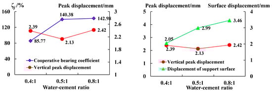 (1) The cooperative bearing coefficient increases with the increase in the water–cement ratio. When the water–cement ratio is 0.8, ζj reaches the largest value of 2.75%. When the water–cement ratio is 0.4 and 0.5, ζj is 0.79% and 1.12%, respectively.