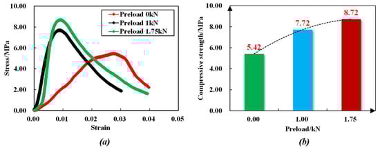 Stress–strain curve of the anchoring–grouting system with different preloads. (a) Stress–strain curve. (b) Compressive strength curve.
