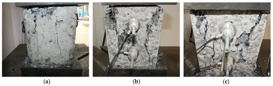 (2) The supporting member exerts a preload on the anchoring–grouting system, thereby constraining the specimens. The cracks are compacted and closed, which improves the elastic modulus and the bearing capacity, giving full play to the support strength, and realizing the active reinforcement of the anchoring–grouting system. The main crack of the anchoring–grouting system with a preload of 0 kN presents a splitting failure from top to bottom, while that with a preload of 1.75 kN presents an X failure pattern, and a small broken specimen is extruded in the free area between the supporting members.