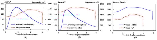 When the preload is 0 kN, no supporting member is set in the system, so it is impossible to monitor the stress of the supporting member. The stress changes of the supporting members were compared when the preload was 1 kN and 1.75 KN. The bearing capacity of the anchoring–grouting system and the stress curve of the supporting members are shown in Figure 13.