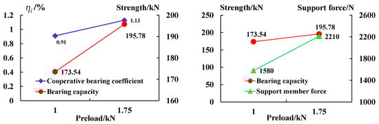 (3) When the preload is increased from 1 kN to 1.75 kN, the peak value of the support member internal force increases from 1580 N to 2210 N, but the increase rate of the support members decreases from 58% to 14%.