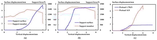 (1) The displacement of the support surface with a preload of 1.0 kN keeps increasing until a sudden drop, when the support force also drops suddenly. However, the displacement of the specimen with a preload of 1.75 kN increases and then remains a constant value, which is much lower than that with a preload of 1.0 kN.