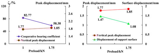 (2) When the stress of the supporting member drops suddenly, the vertical displacement of the anchoring–grouting system with a preload of 1.75 kN is 7.9 mm, while that of 1 kN is 6.1 mm. A higher preload can give full play to the support strength potential of the components.