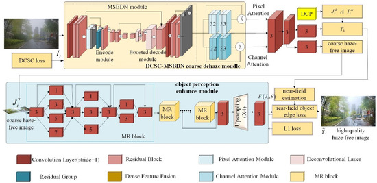 Given the training set, , where and denote the i-th hazed image and the true value of the haze-free image, respectively, in view of the better fitting ability of deep learning-based image-dehazing methods, this paper adopts an MSBDN network [32] as the backbone of the dehazing network. The MSBDN network adopts the U-Net [33] architecture, which utilizes multi-scale feature encoding and boosted multi-scale feature decoding to enhance the dehazing effect and uses the dense feature fusion module to absorb the complementary information of multi-scale features.