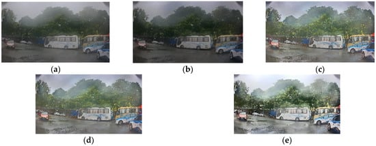 The ablation experiment results for road inspection images. (a) Original image. (b) MSBDN method. (c) DCSC-MSBDN method. (d) MSBDN-OPE method. (e) DCSC-OPE-Net method.