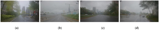 The road inspection images obscured by haze. (a–d) display haze images acquired from different roads.