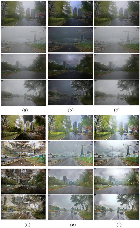 Mean Gradient (MG): This metric is an index used to assess the clarity of an image [29], which not only evaluates the image dehazing effect, but also illustrates the ability to maintain key features of the road surface. The basic idea is to evaluate the clarity of an image by measuring the average value of the pixel gradient in the image. In calculating the average gradient, the gradient value of each pixel in the image first needs to be calculated using the Sobel operator. Then, the gradient values of all the pixels are averaged to obtain the average gradient value. The larger the average gradient value, the higher the clarity of the image, and vice versa. The formula for calculating this metric is