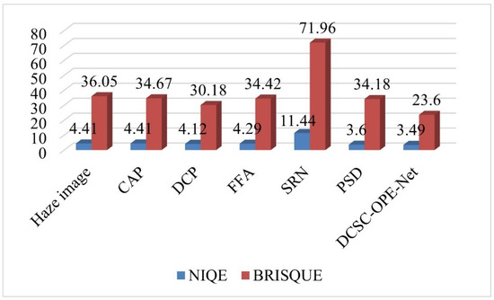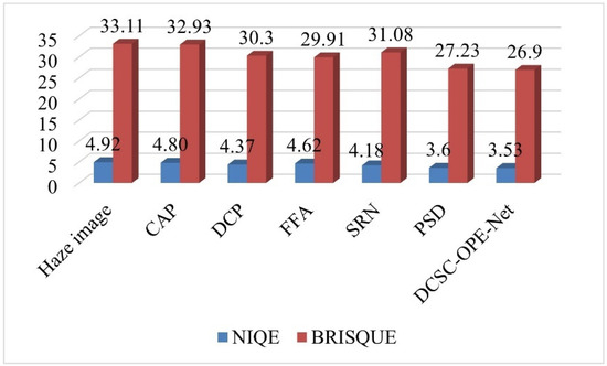The BRISQUE (Blind/Referenceless Image Spatial Quality Evaluator) and NIQE (Natural Image Quality Evaluator): these two types of metrics are commonly used image quality evaluation metrics based on pixel statistics results. These two metrics, as hybrid indicators, include different evaluation manners, such as the gradient, contrast, color distribution, etc. Meanwhile, they do not need reference images and can automatically evaluate the quality of images, which is widely used in the evaluation of dehazing methods [39].