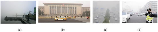 The representative images in public datasets obscured by haze. (a–d) display haze images acquired from different scenes.
