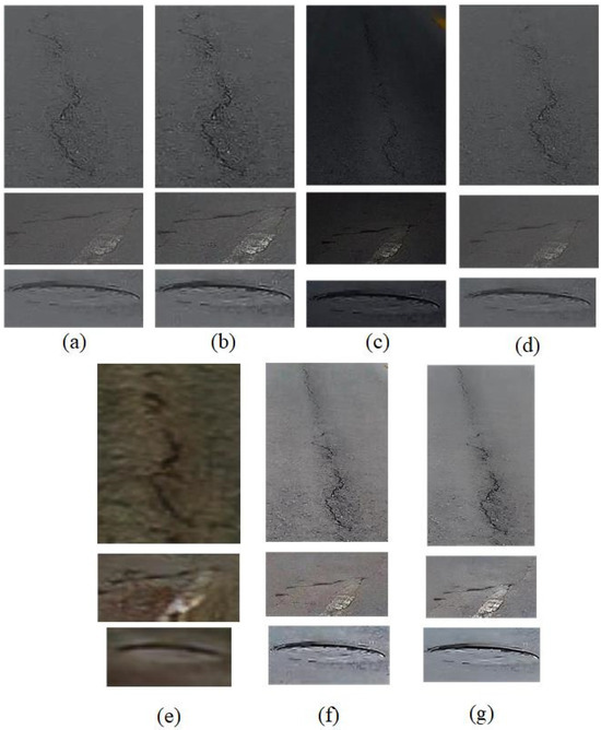 The proposed method has the ability to perceive near-view objects and enhance their edge features. To evaluate this advantage, typical road disease objects, such as road depressions, cracks, etc., cutting from haze-free images generated using different dehazing methods are selected for the comparison experiments. The extracted object slices are shown in the following figure.
