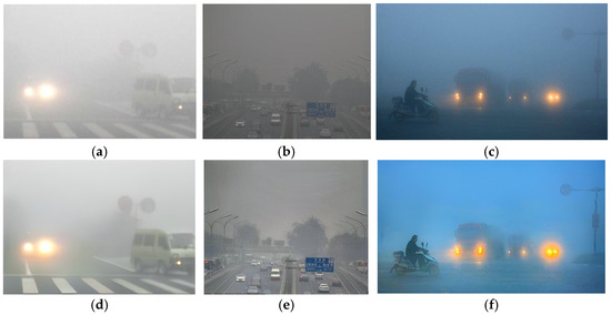The image-based intelligent road inspection system can effectively extract road surface cracks, grooves, and other road disease objects and then provide adequate information for road management [1,2,3]. However, due to weather conditions, the haze interference phenomenon for road inspection will have a greater negative impact, which may seriously damage the image’s visual effect, thus hindering the execution of inspection work. Not only that, but haze contamination may also reduce the contrast of the images and cause confusion about objects in the road, such as crack features, and then interfere with the object extraction results obtained via intelligence methods. To recover image quality for effective road inspection, it is necessary to study the single-image dehazing method to substantially improve the quality of hazed images and ensure the implementation of intelligent road inspection under different cases and the maintenance of municipal facilities.