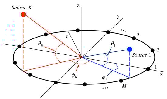 Without loss of generality, we consider the origin-centered UCA-based receiver consisting of M antenna elements, which tries to estimate DOAs of K signal sources as illustrated in Figure 1.