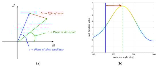 Figure 2. An example of the conventional CI-based DOA estimation due to additive noise (ideal DOA is 180 ; estimated DOA is 196 ). (a) Effects of additive noise on phase angle of complex signal. (b) Effects of additional noise on cost function value estimation.