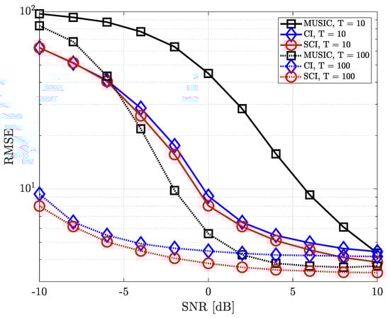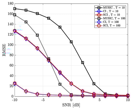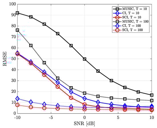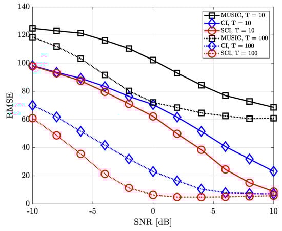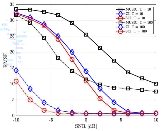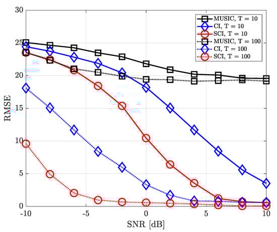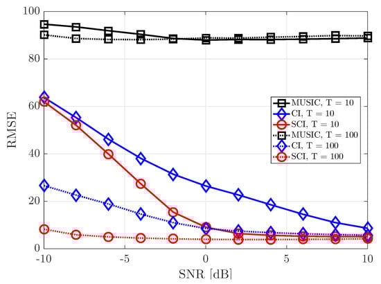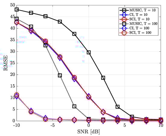 Figure 8 shows the RMSE performance for varying SNR values when the number of UCA antenna elements is equal to 5 ( M = 5 ) and two signal sources exist ( K = 2 ). As the number of antenna elements in UCA decreases, the corresponding beam width becomes wider. Then, the DOA estimation performance becomes gradually deteriorated in both MUSIC- and CI-based DOA estimation techniques. Nonetheless, the conventional and proposed CI-based techniques perform better than the MUSIC-based DOA estimation technique and result in more accurate DOA information when SNR is sufficiently high, even in the case of a small number of time samples ( T = 10 ). Furthermore, the proposed simultaneous CI technique achieves the best DOA estimation performance among all the considered DOA estimation techniques. When a sufficient number of time samples are obtained ( T = 100 ), the proposed simultaneous CI technique achieves a very elaborate DOA estimation performance even in a low-SNR regime.